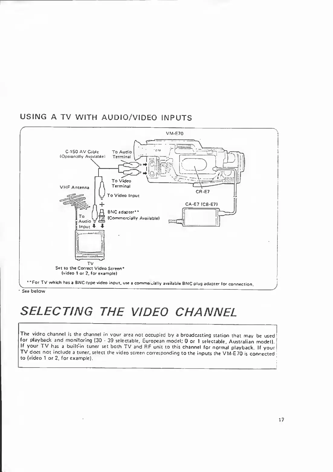 Canon VM-E70 - SELECTING THE VIDEO CHANNEL; TV Connection with Audio;Video Inputs