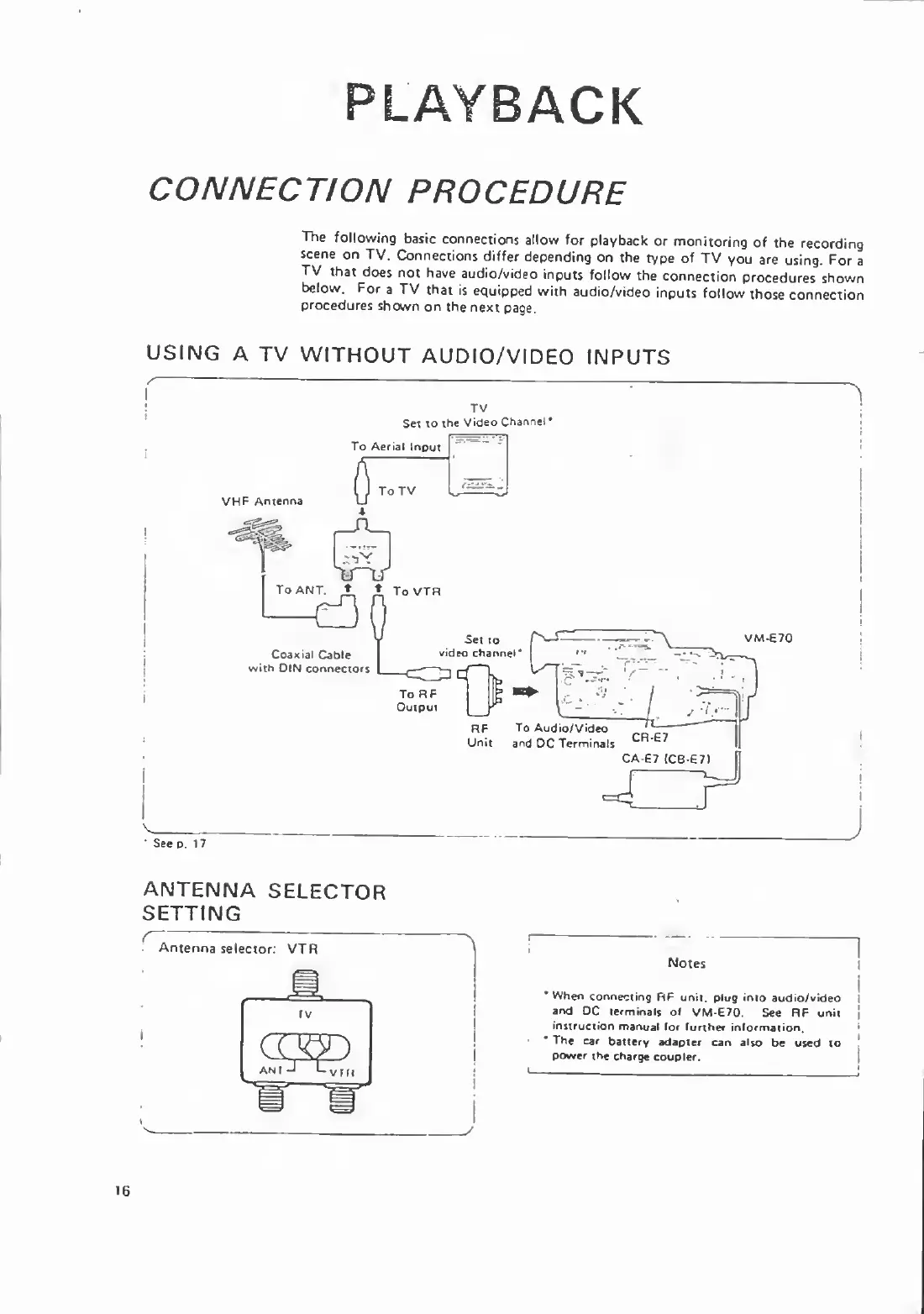Canon VM-E70 - PLAYBACK; Connection Procedure (No A;V Inputs); Antenna Selector Setting