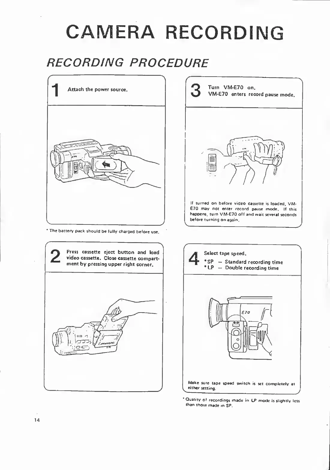 Canon VM-E70 - CAMERA RECORDING; Attach Power Source; Load Video Cassette; Turn On and Select Tape Speed