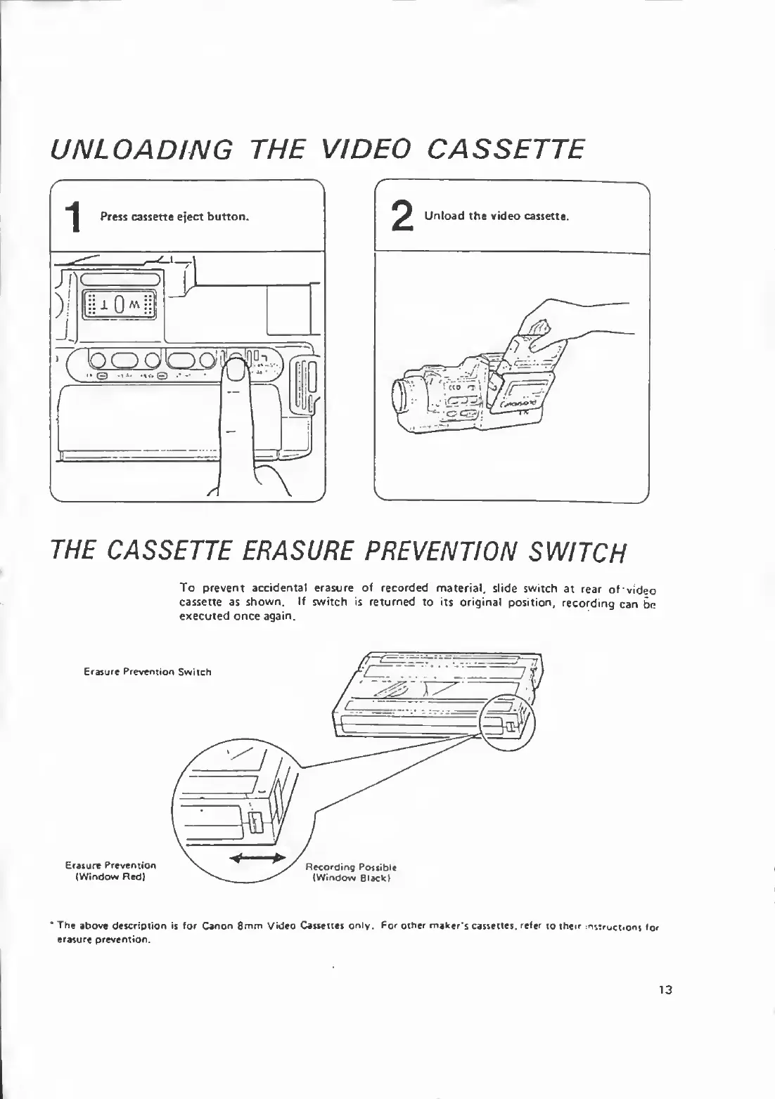 Canon VM-E70 - UNLOADING THE VIDEO CASSETTE; Procedure for Unloading Cassette; Erasure Prevention Switch