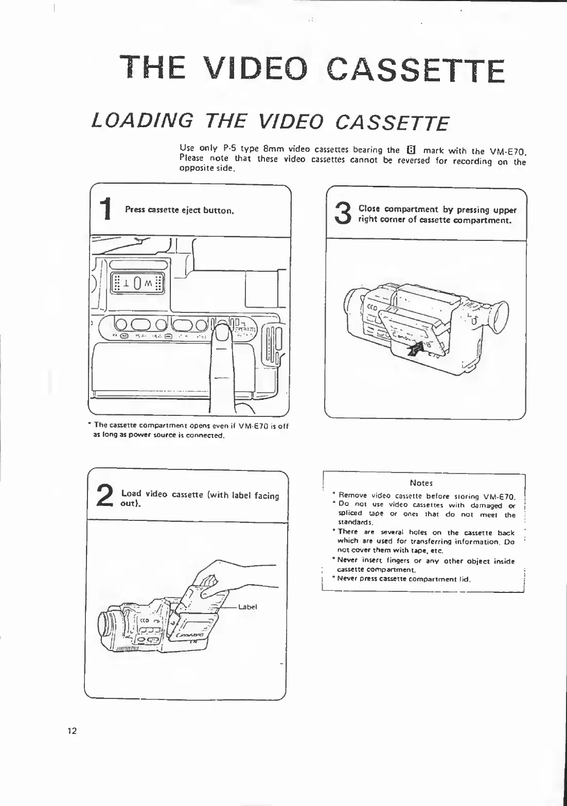 Canon VM-E70 - THE VIDEO CASSETTE; Loading the Video Cassette; Video Cassette Notes