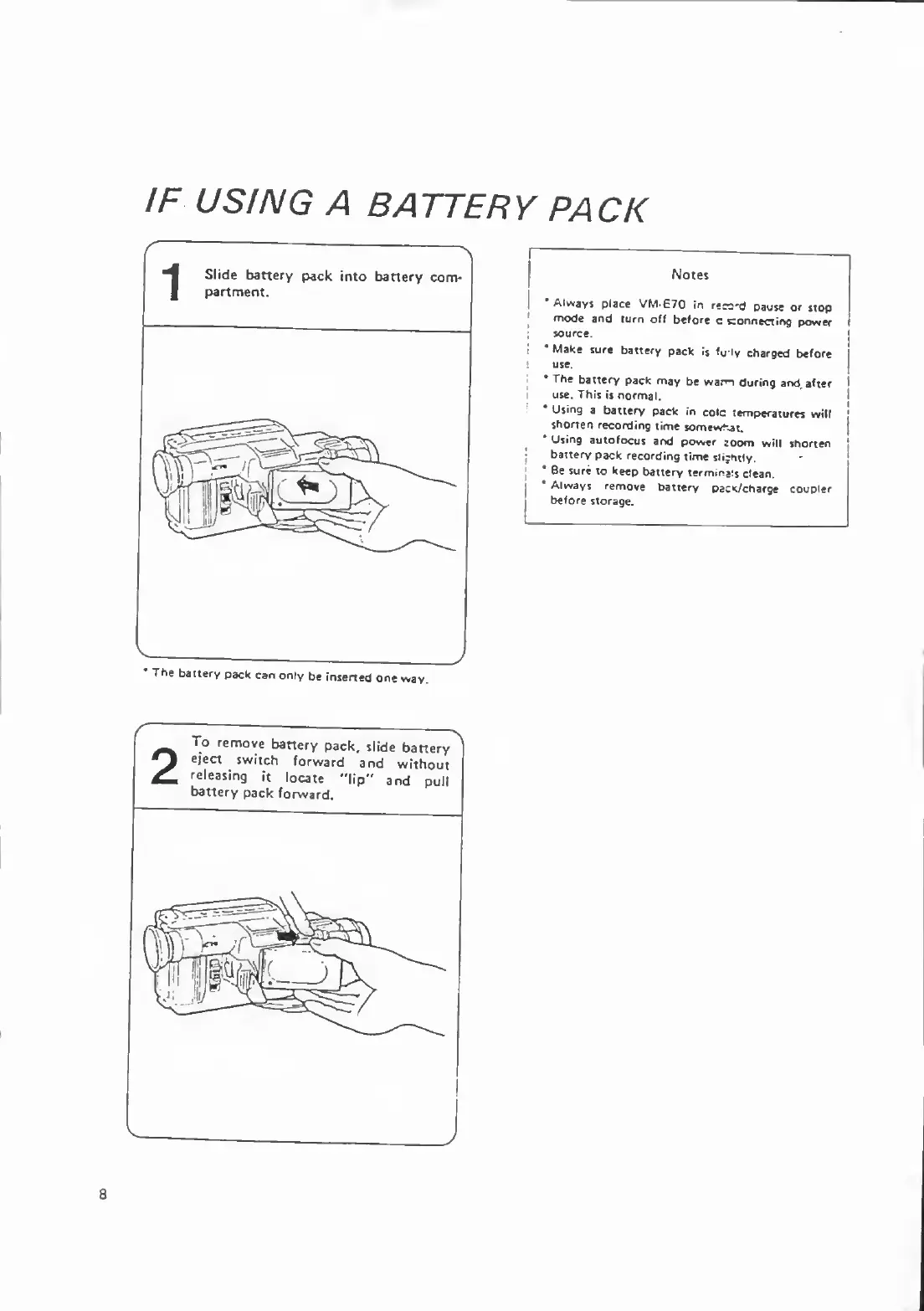Canon VM-E70 - IF USING A BATTERY PACK; Inserting the Battery Pack; Removing the Battery Pack; Battery Pack Usage Notes