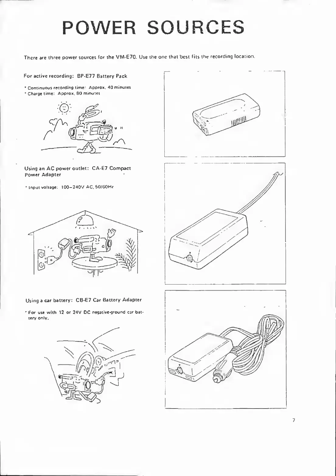 Canon VM-E70 - POWER SOURCES; BP-E77 Battery Pack; CA-E7 Compact Power Adapter; CB-E7 Car Battery Adapter
