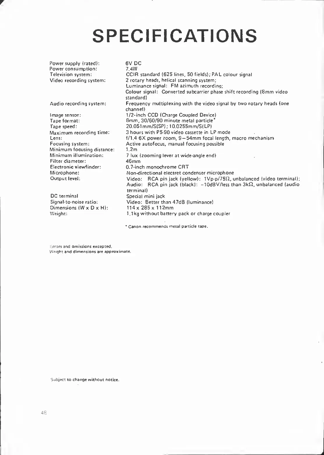 Canon VM-E70 - SPECIFICATIONS; Power and System Specs; Image Sensor and Lens Specs; Audio and Output Specs