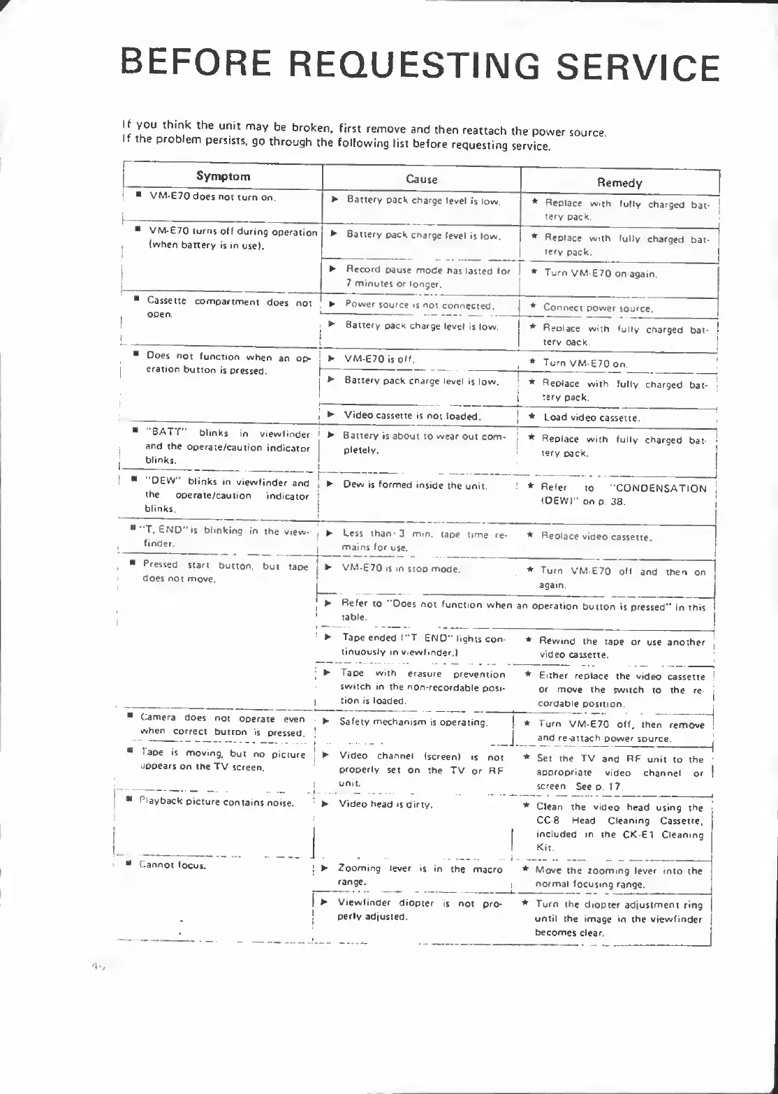 Canon VM-E70 - BEFORE REQUESTING SERVICE; Troubleshooting Common Issues