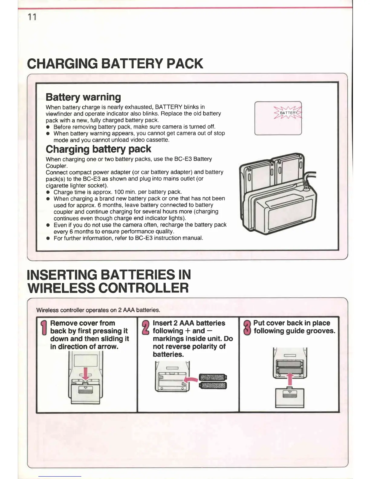 Canon VM-E708 - Charging Battery Pack; Battery Warning and Charging; Inserting Batteries in Wireless Controller; Controller Battery Installation