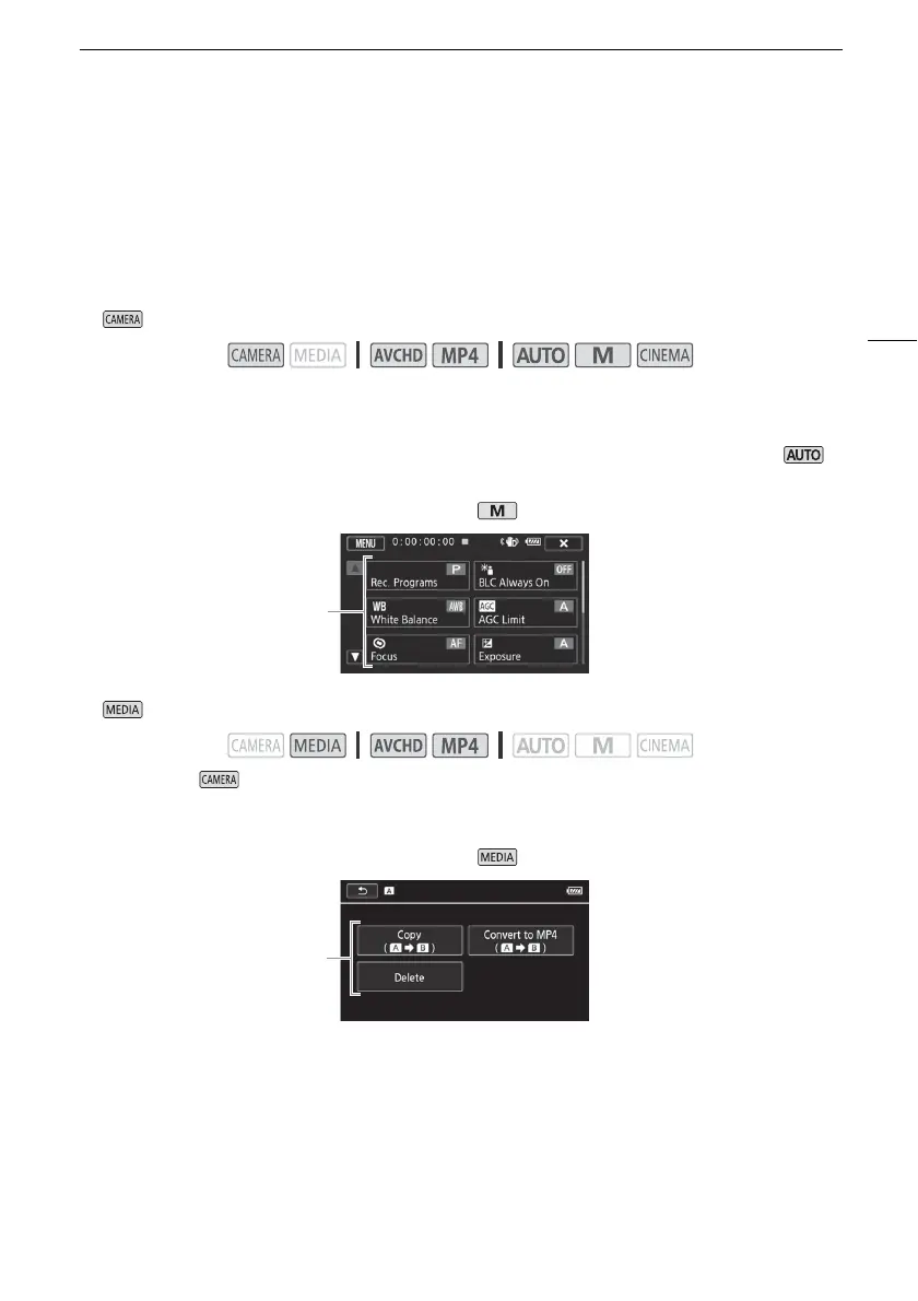 Many of the camcorder’s functions can be adjusted from the FUNC. menu and the setup menus. For