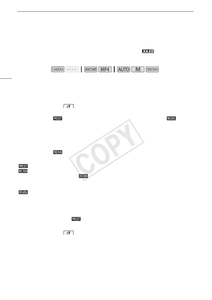 have a continuous time code; with [ Free Run], the time code runs regardless of the camcorder’s