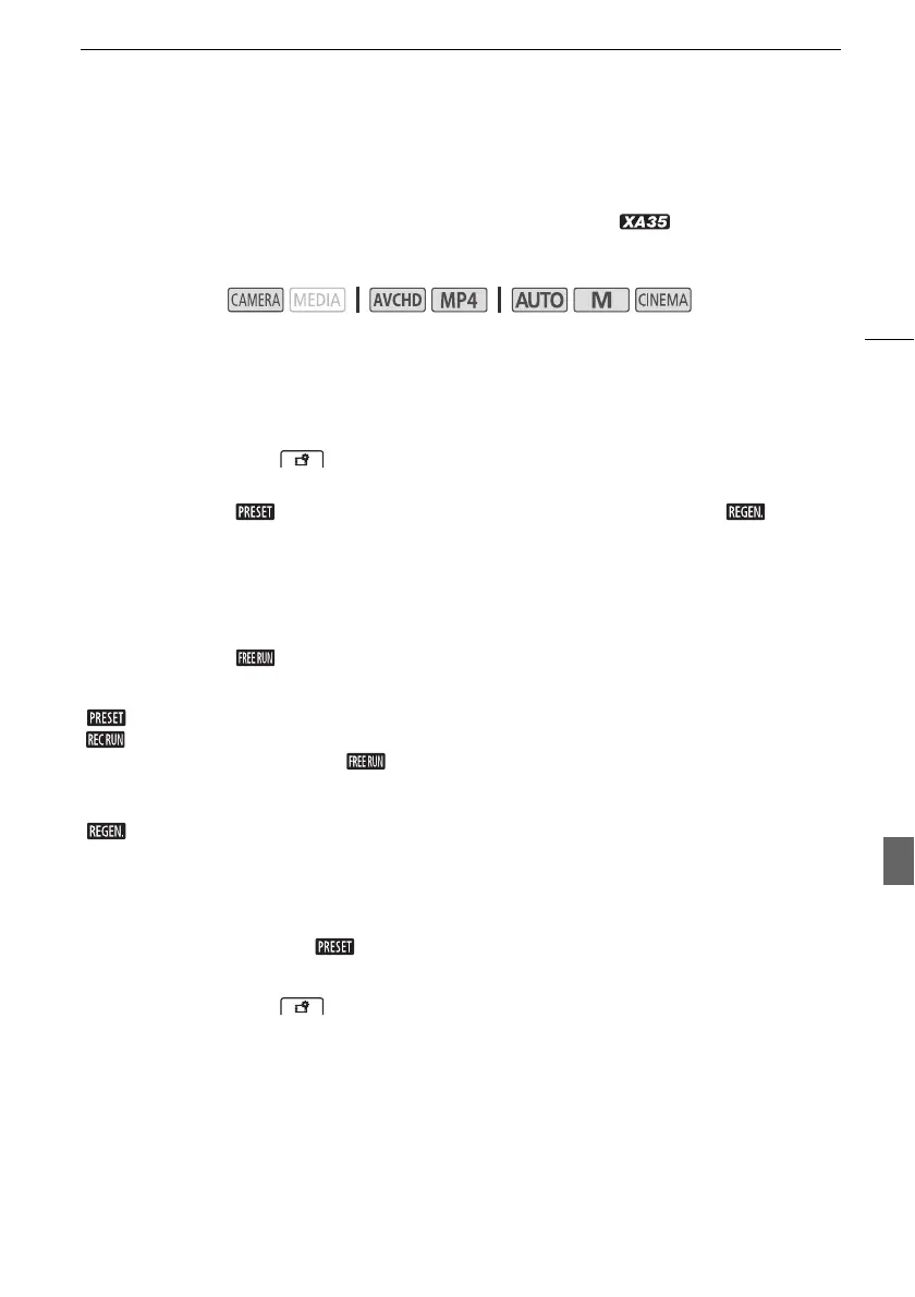 have a continuous time code; with [ Free Run], the time code runs regardless of the camcorder’s