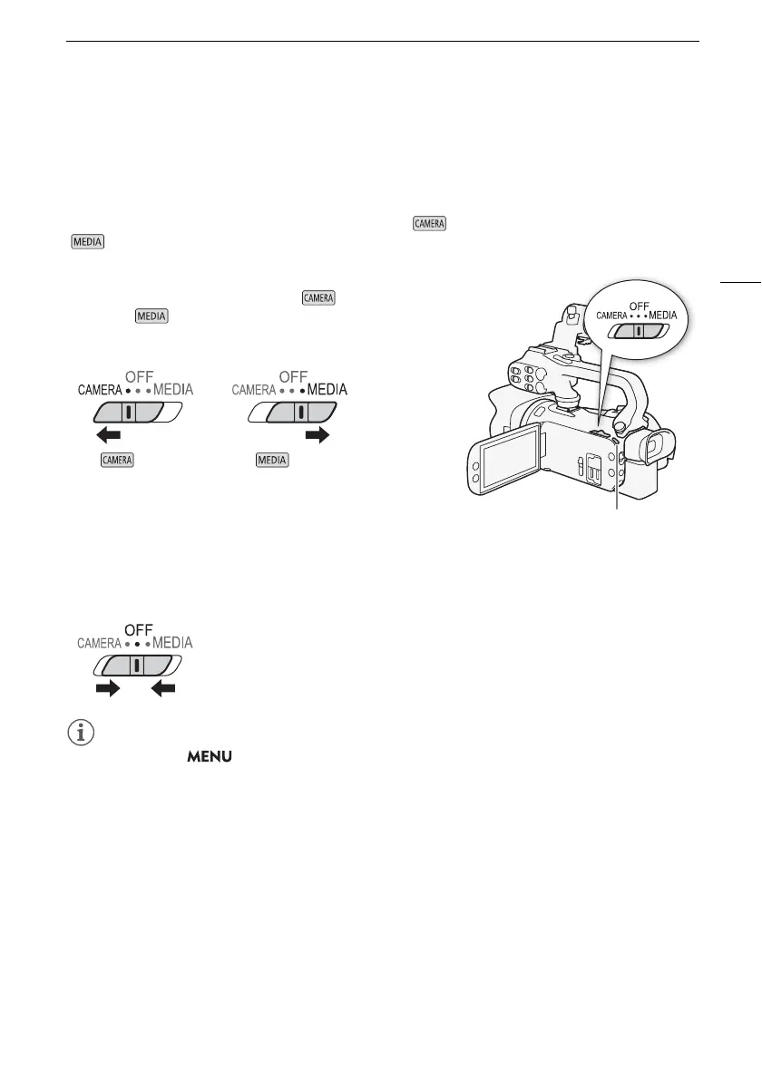 You can choose to turn the camcorder on in CAMERA ( ) mode for making recordings or MEDIA