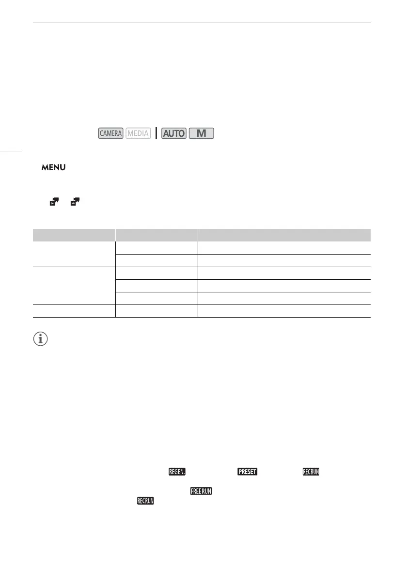 - The time code mode can be set to [ Regen.], or to [ Preset] with [ Rec Run]