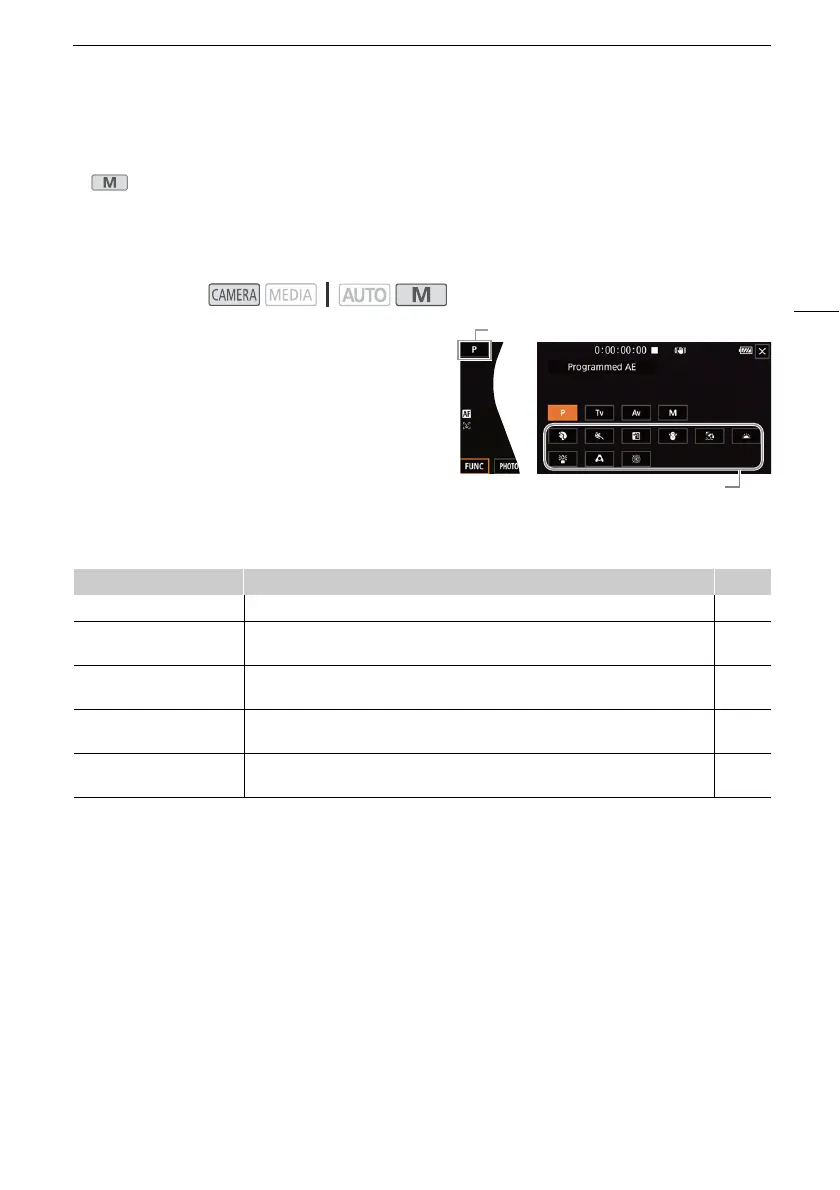 ’ (Programmed AE) The camcorder automatically sets the shutter speed, aperture and gain. 43