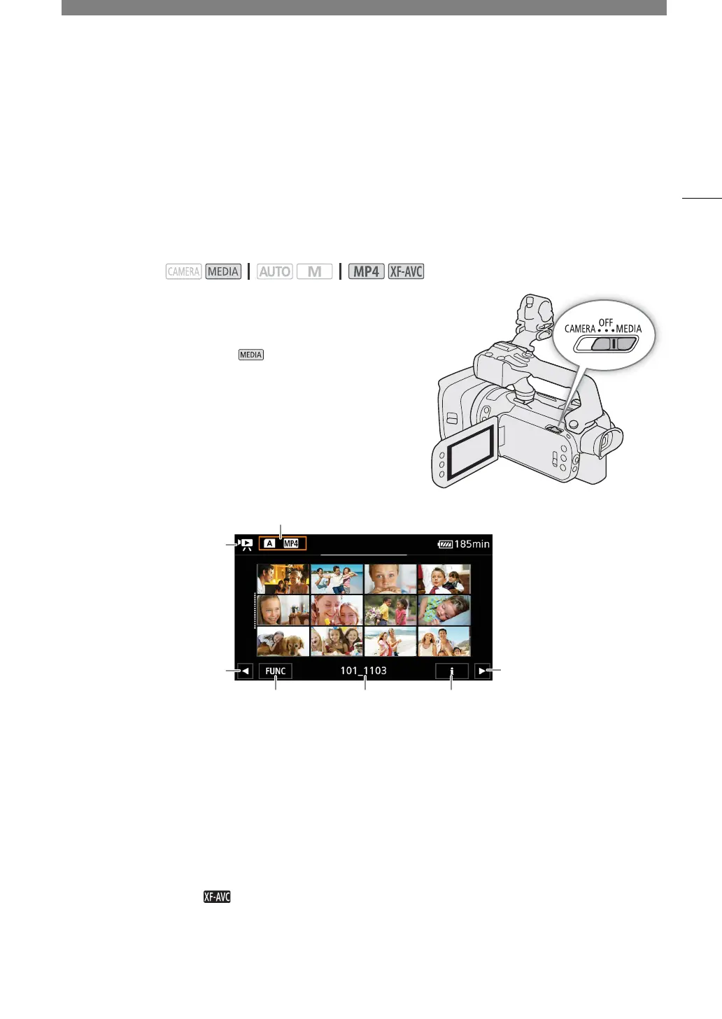 • The camcorder switches to mode and the clip index