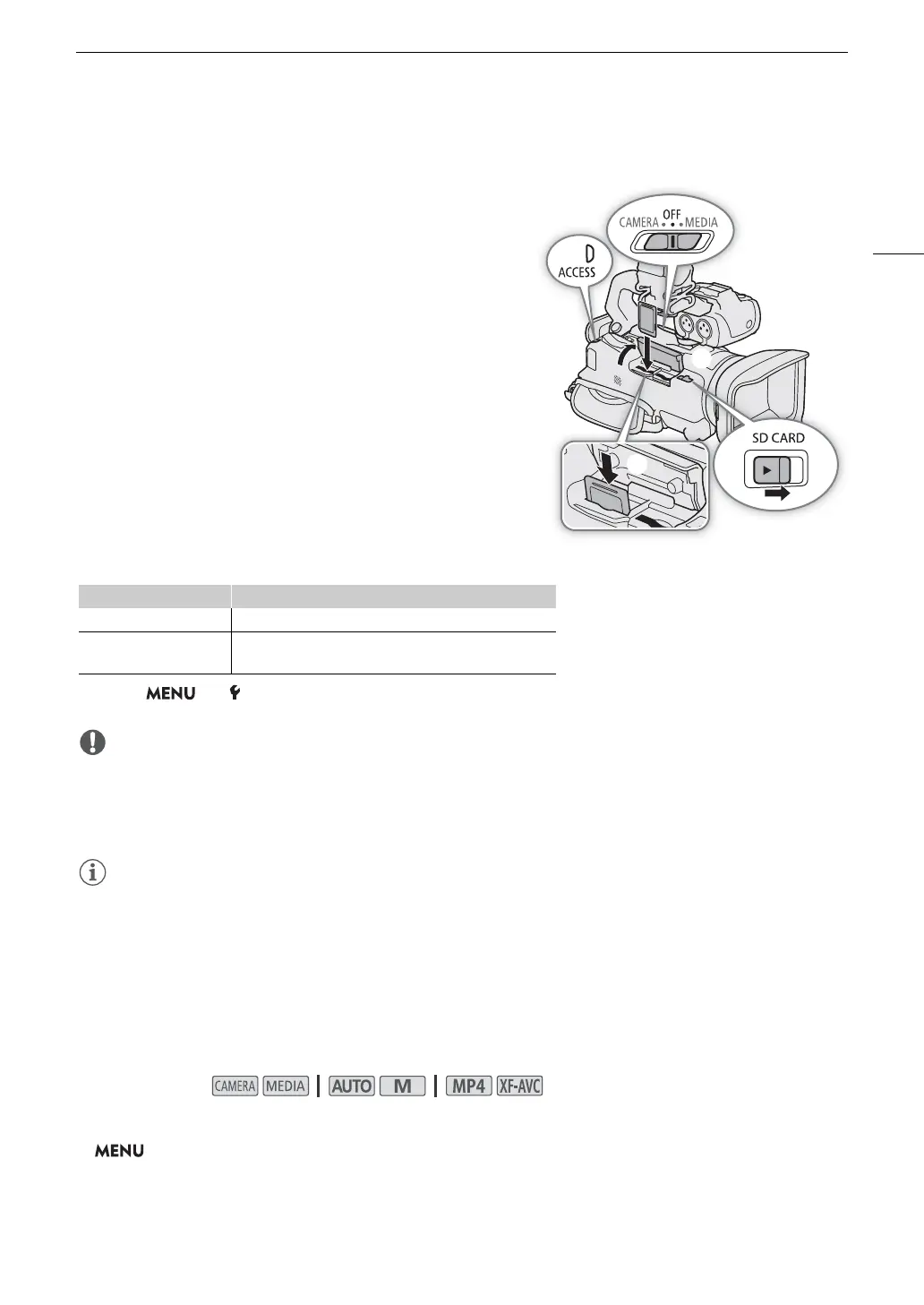 • Turn off the camcorder before inserting or removing a card. Inserting or removing a card with the camcorder
