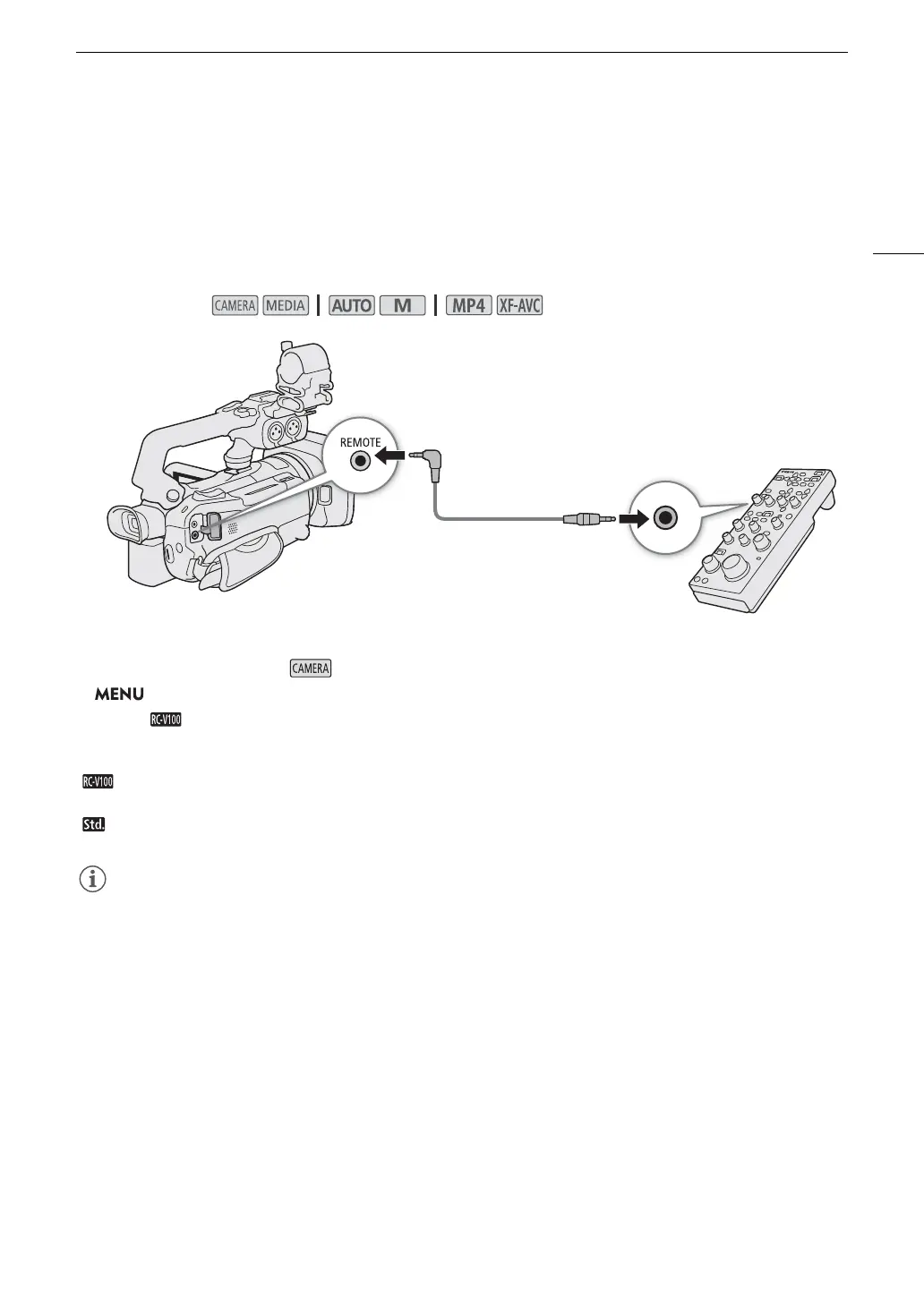 You can connect the optional RC-V100 Remote Controller to the camcorder’s REMOTE terminal in order to