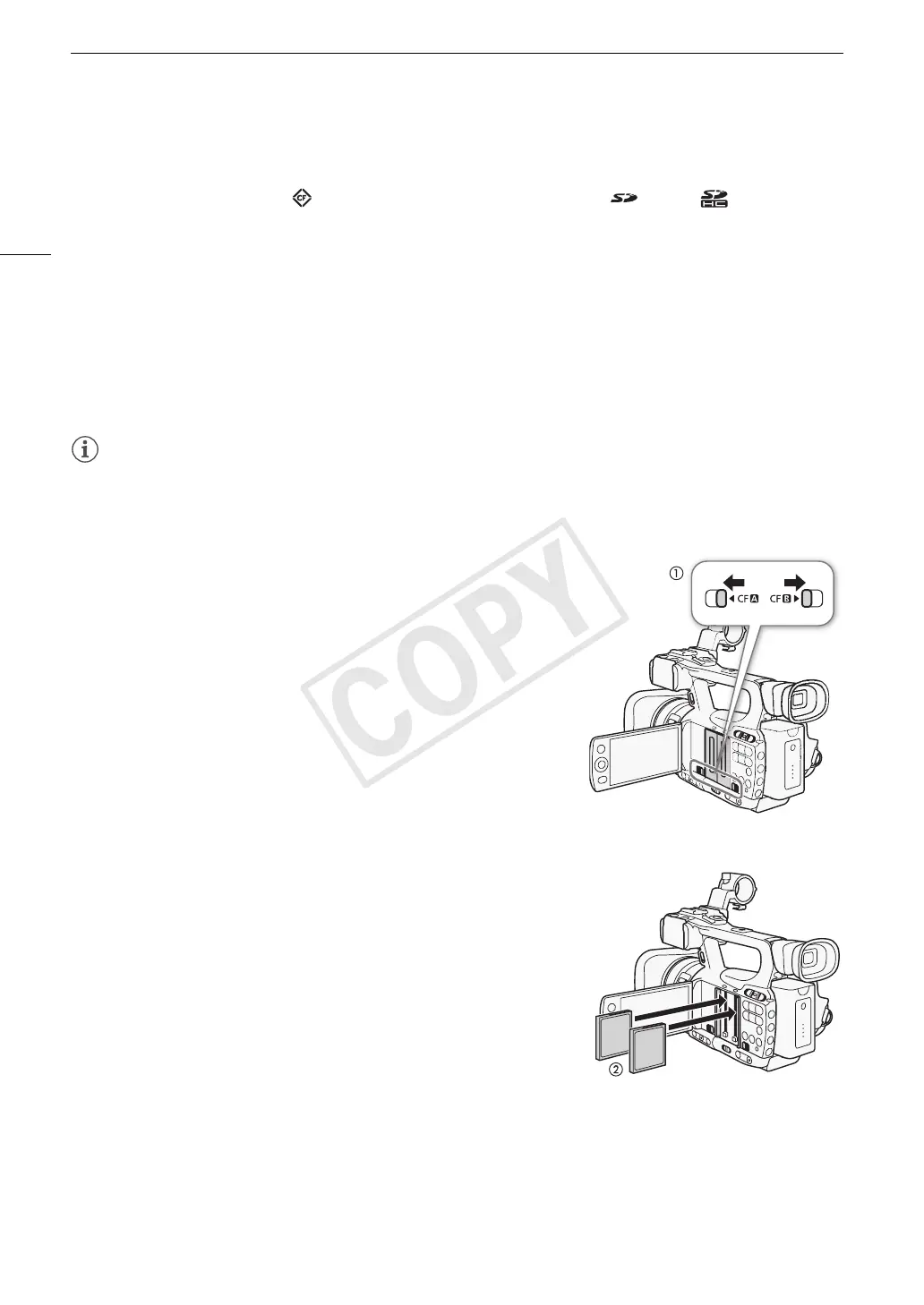 cards. The camcorder is equipped with two CF card slots. Initialize recording media (0 36) when you use them