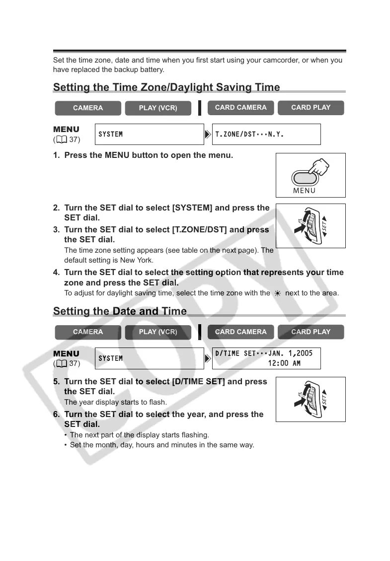 Set the time zone, date and time when you first start using your camcorder, or when you