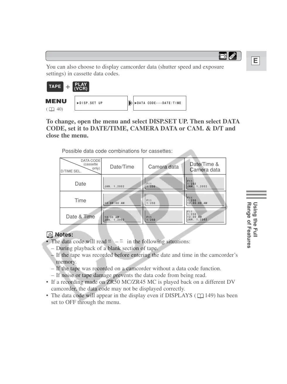 camcorder, the data code may not be displayed correctly.