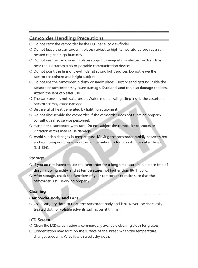 ❍ Handle the camcorder with care. Do not subject the camcorder to shocks or
