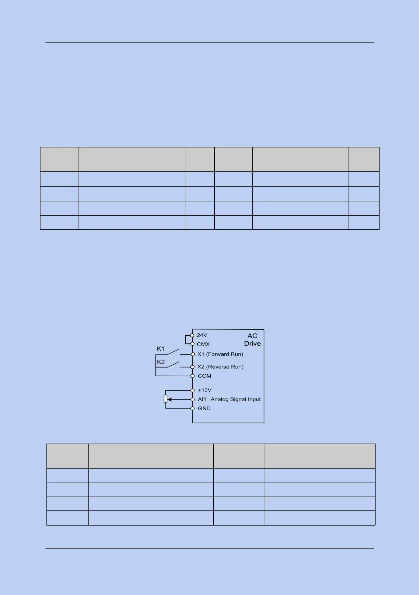 2.1) Terminal X1 controls forward running, X2 controls reverse running, and AI1 signal set the