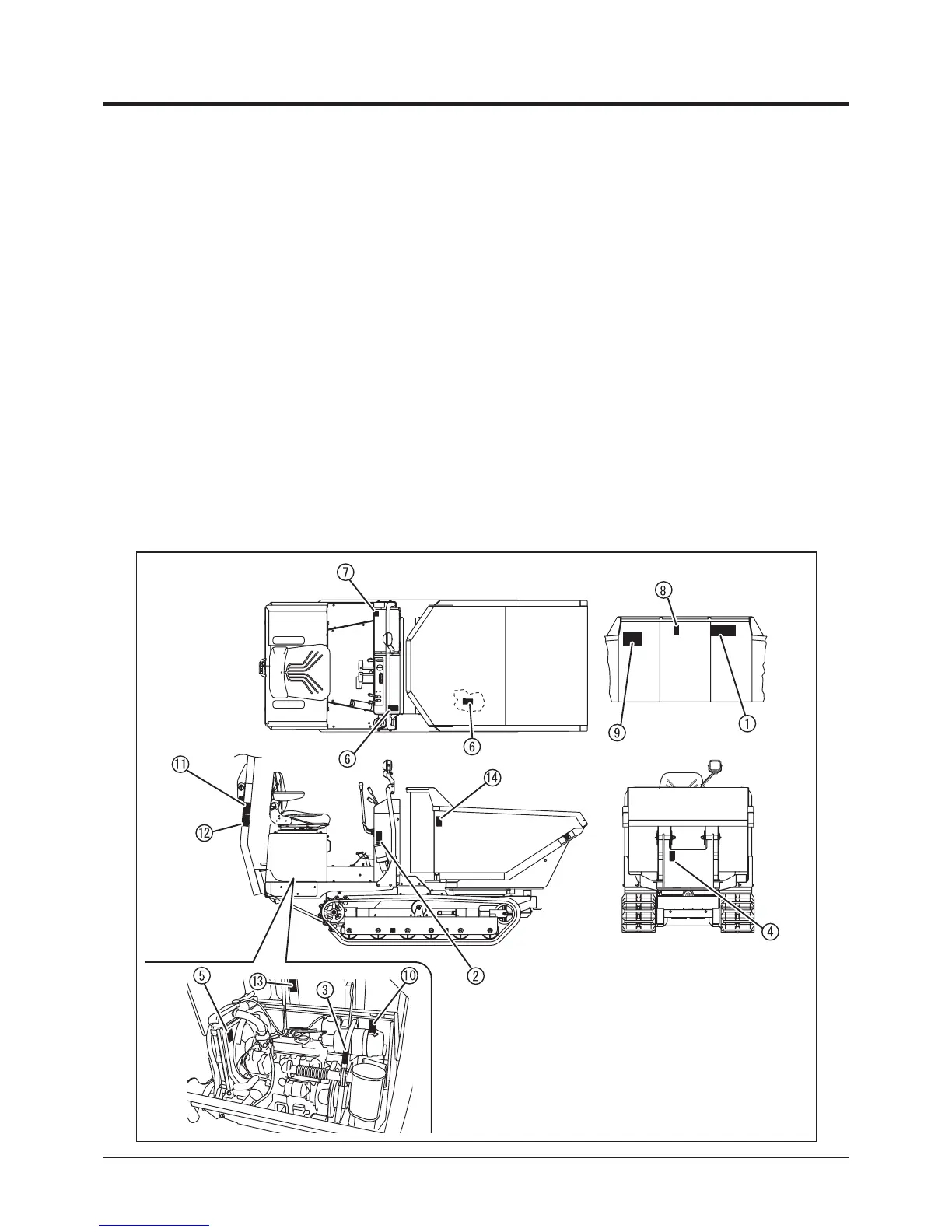 The safety labels shown on the next page are attached to the machine. See the illustration