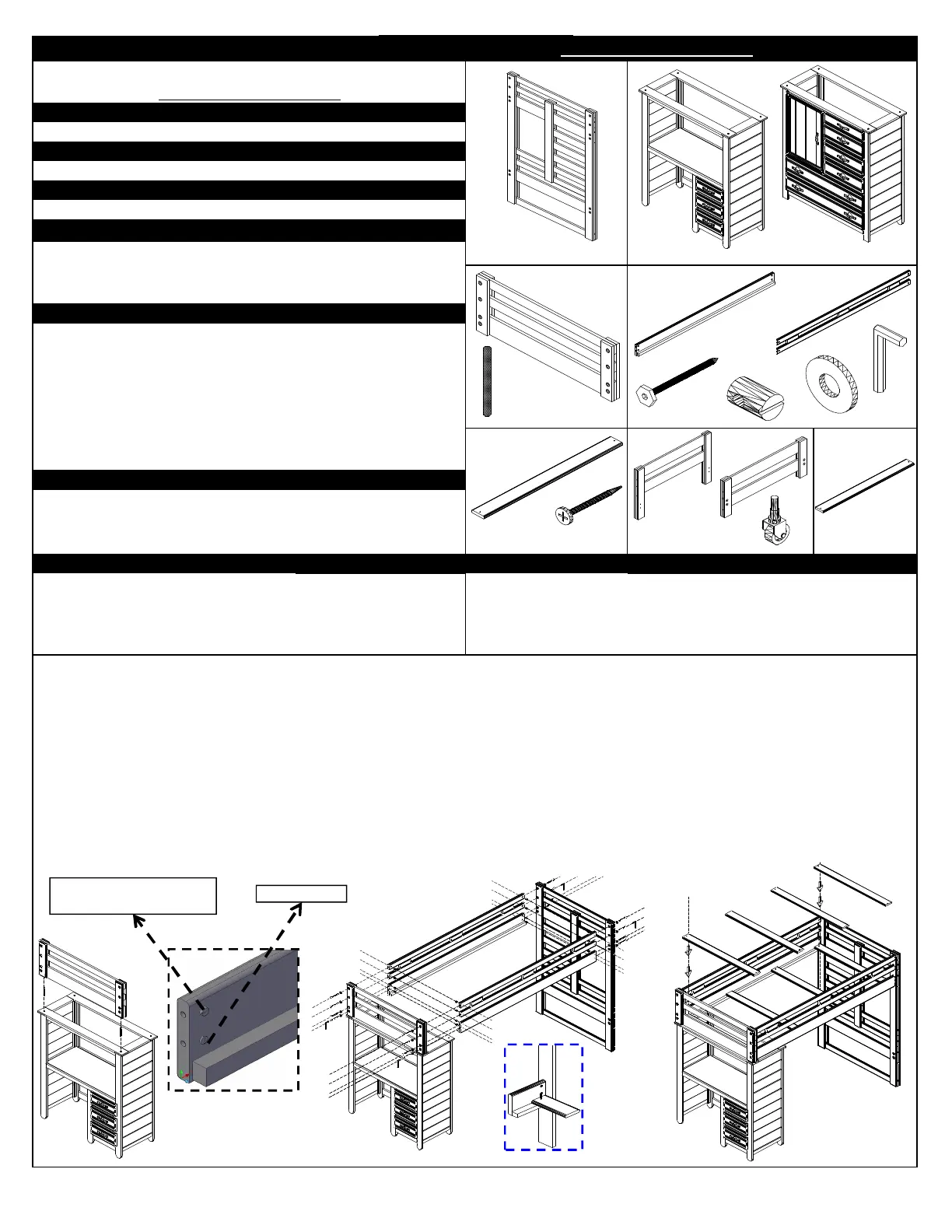 1.- ASSEMBLE TWIN LOFT BUNK BED, USING ONE HEADBOARD ( A),ONE LOFT BED END ( D),TWO SIDE RAILS ( F),TWO GUARDRAILS ( G), 3 DRW STUDENT DESK (B) OR 5 DRW STUDENT
