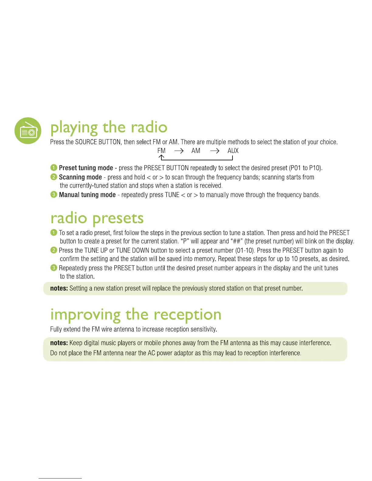 capello CR21 - Playing the Radio; Radio Presets; Improving the Reception