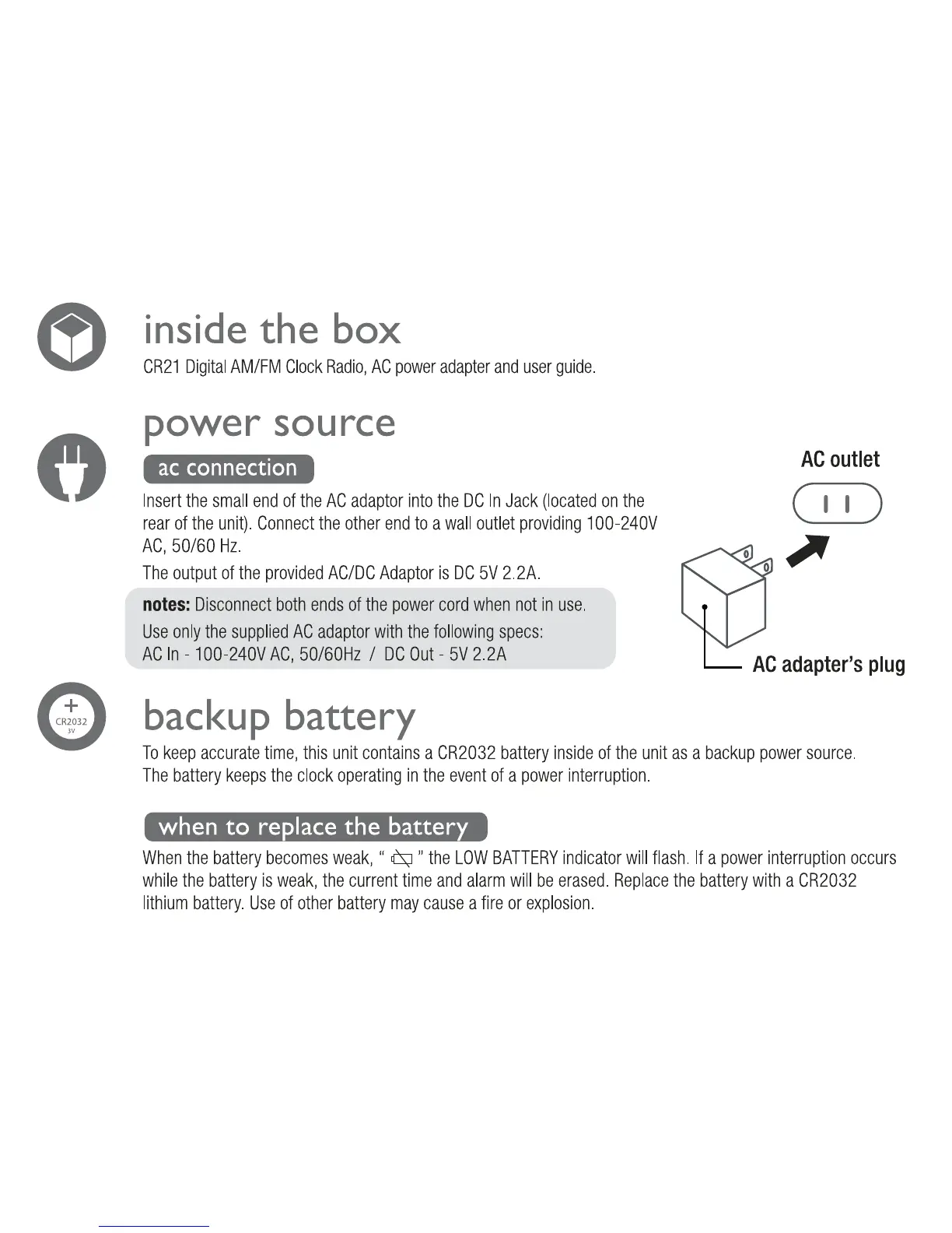 capello CR21 - Inside the Box; Power Source; Backup Battery