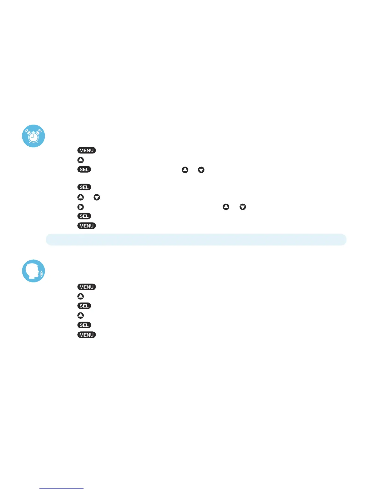note: When alarm sounds, press “MENU” button to turn off alarm or press “SNOOZE” button to delay alarm for 9 minutes.