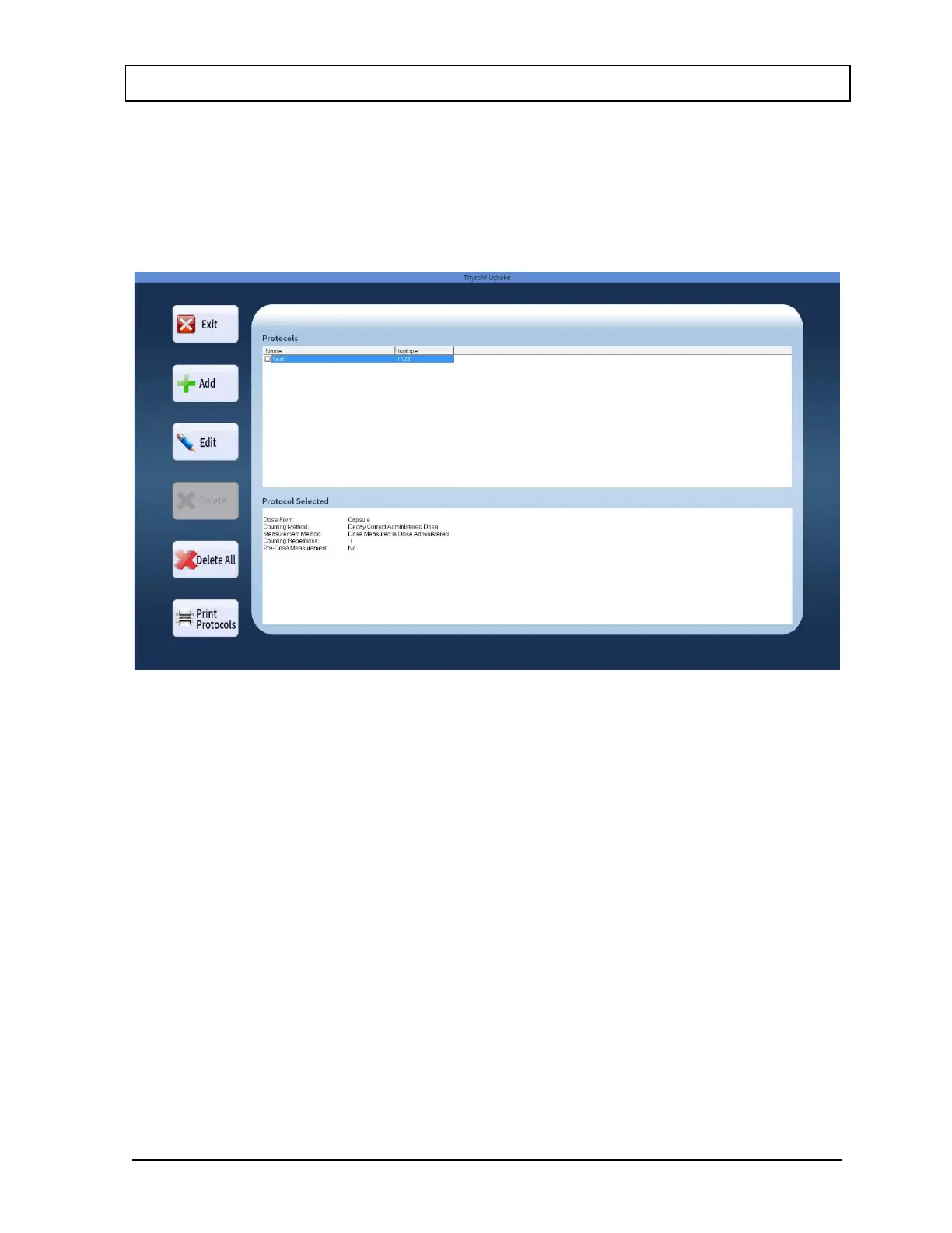 7-2 Protocols Screen. The Protocols box is empty the first time, because there are no
