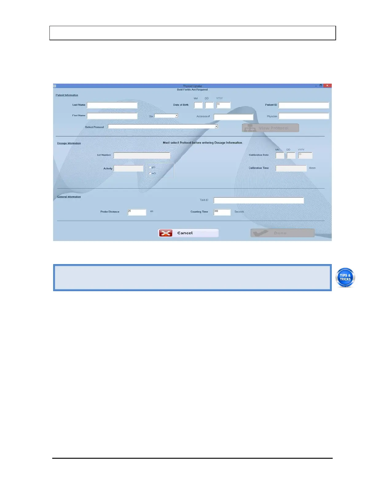 • Input the Last Name, First Name, Date of Birth, Patient ID and Physician.