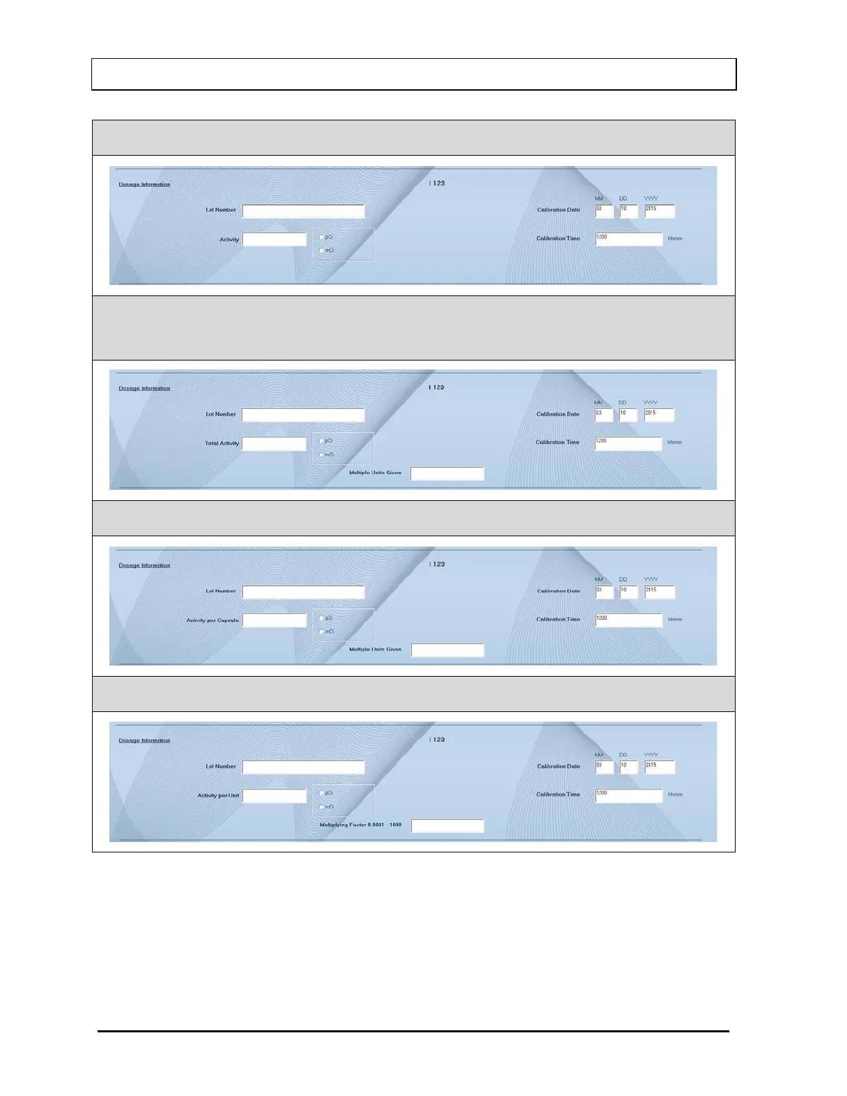 • The Lot Number, Calibration Date, Activity and Calibration Time may be