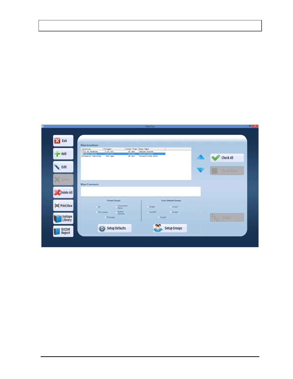 In Figure 8-8 below, the “Tech187” group is selected and only the wipe tests belonging to