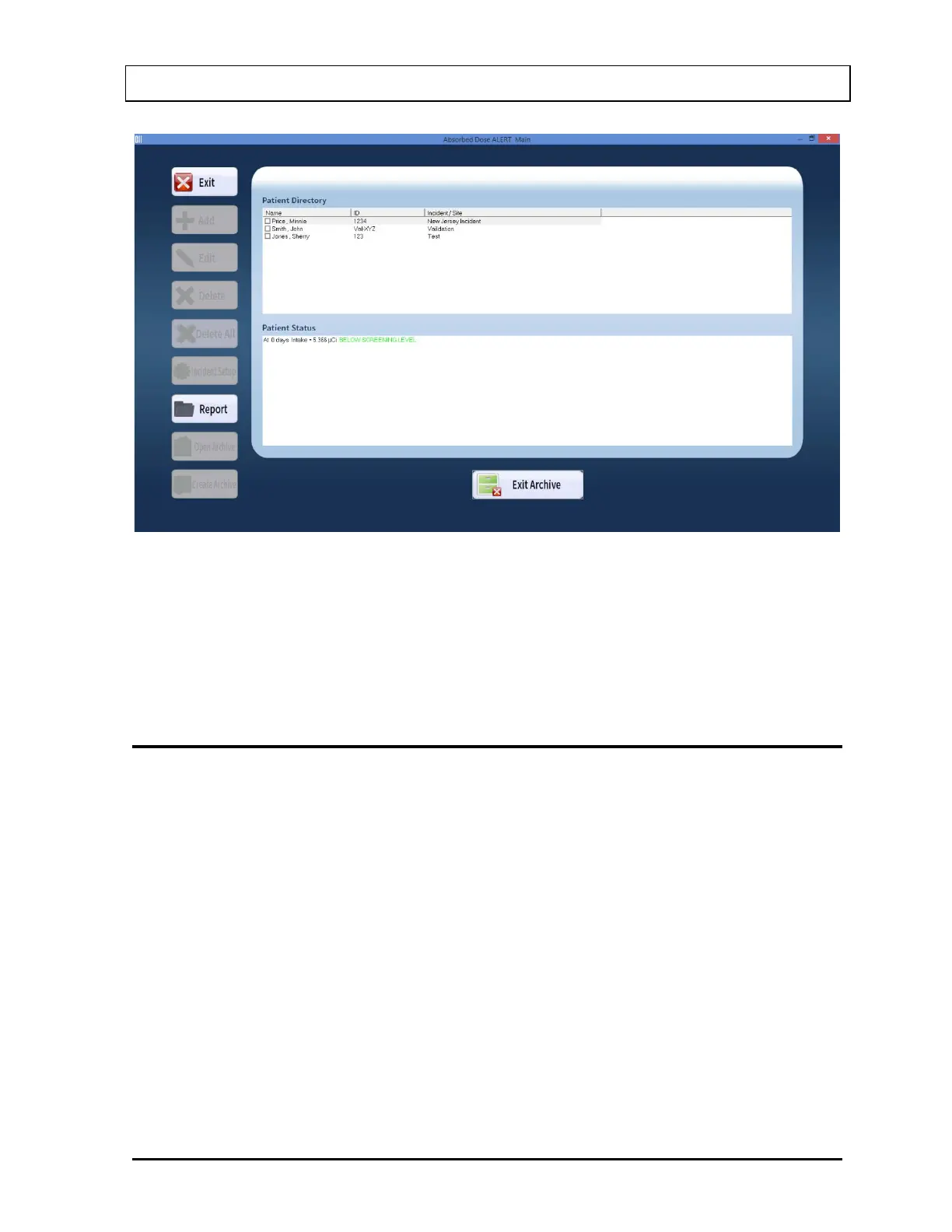 1. On the Absorbed Dose ALERT Main Screen, select the Report button. The screen