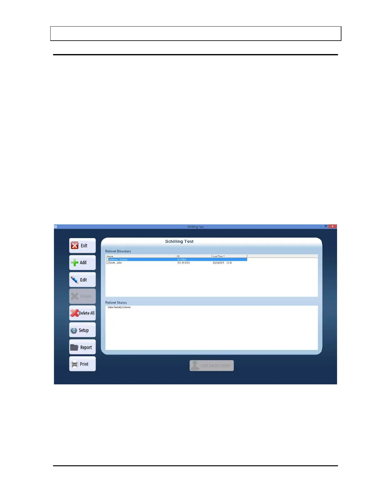 Figure 10-2 Schilling Test Main Screen will appear. The Patient Directory box will be empty