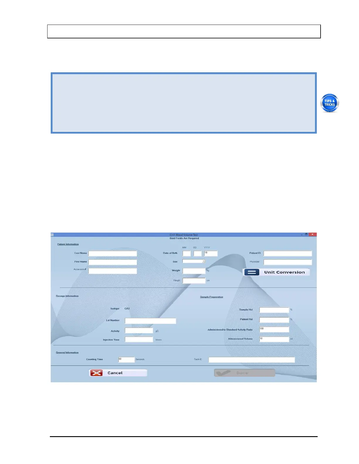 Note: All fields in bold are required before you can begin the Cr51 Blood Volume Test.