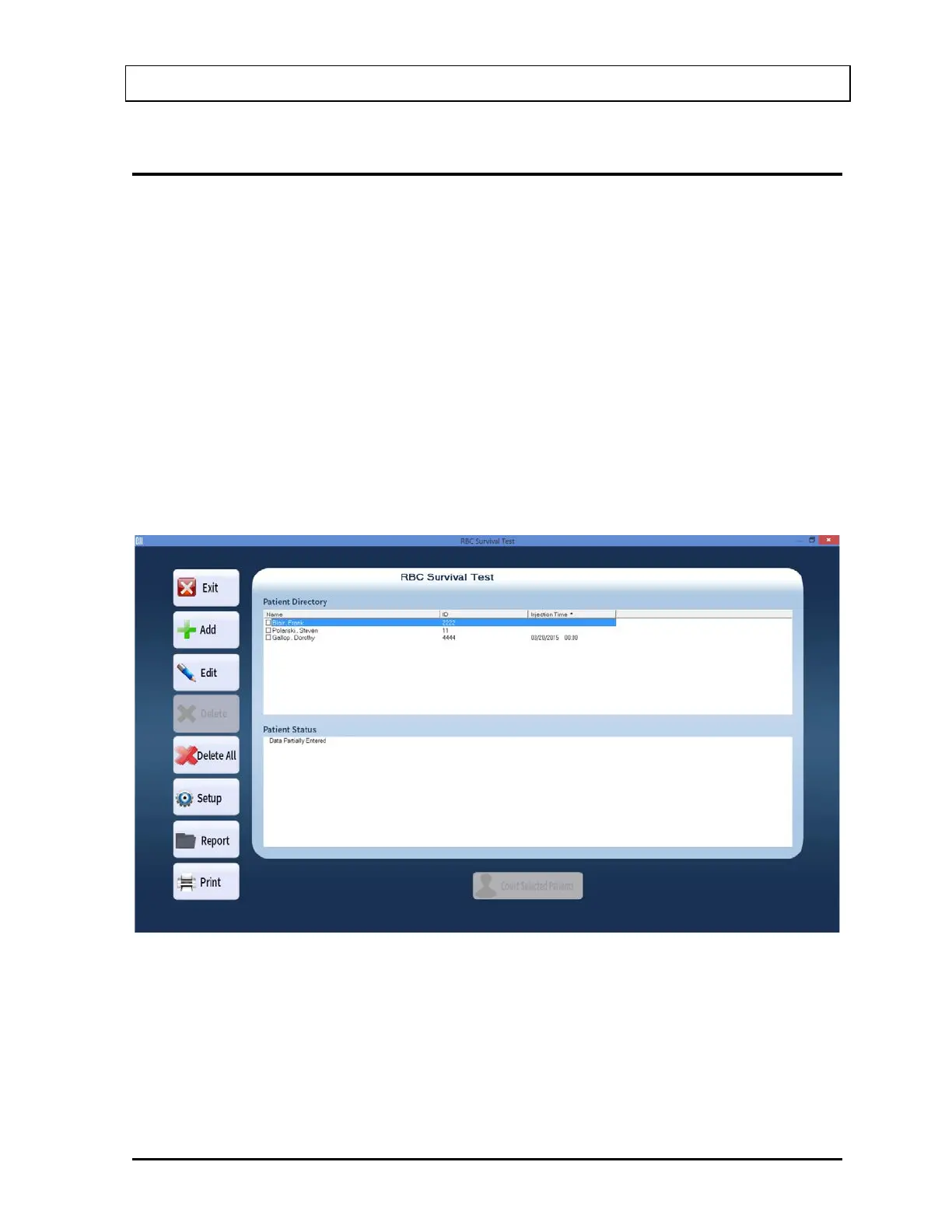 Screen. Figure 10-64 RBC Survival Test Main Screen will appear. The Patient Directory