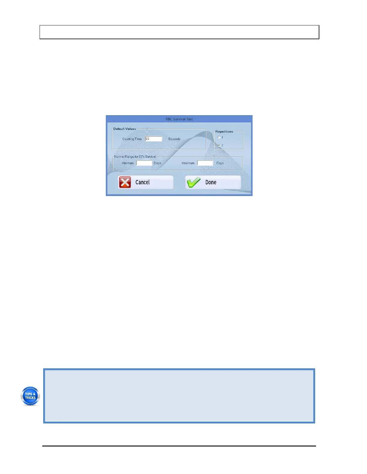 1. Select the Setup button on the RBC Survival Test screen. The screen appears as shown