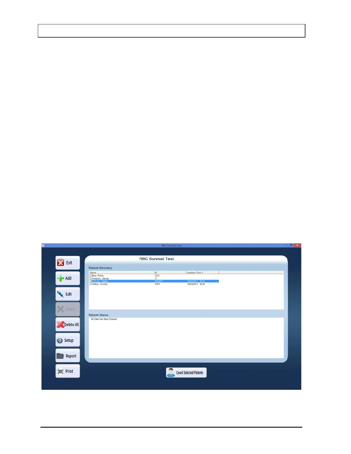 6. To add more patients, select the Add button on Figure 10-64 RBC Survival Test Main