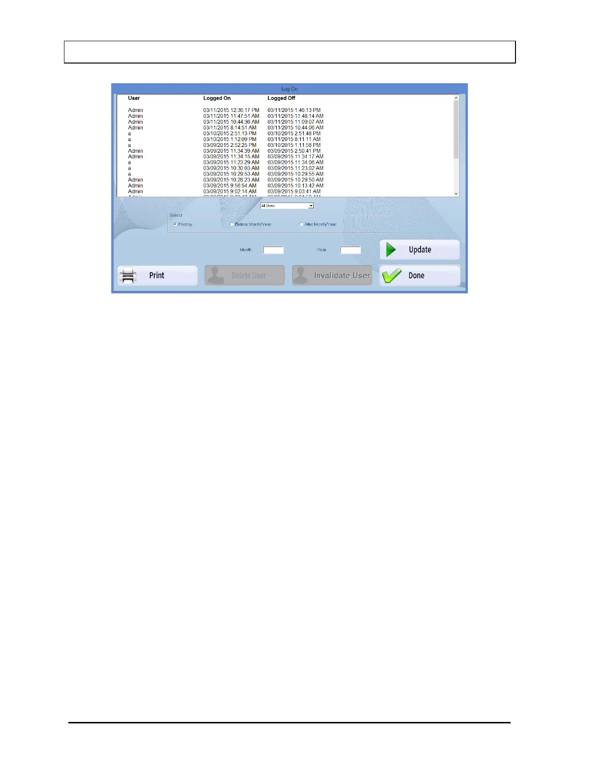 Update button. The Log On Report window will be updated to show only the log on data for