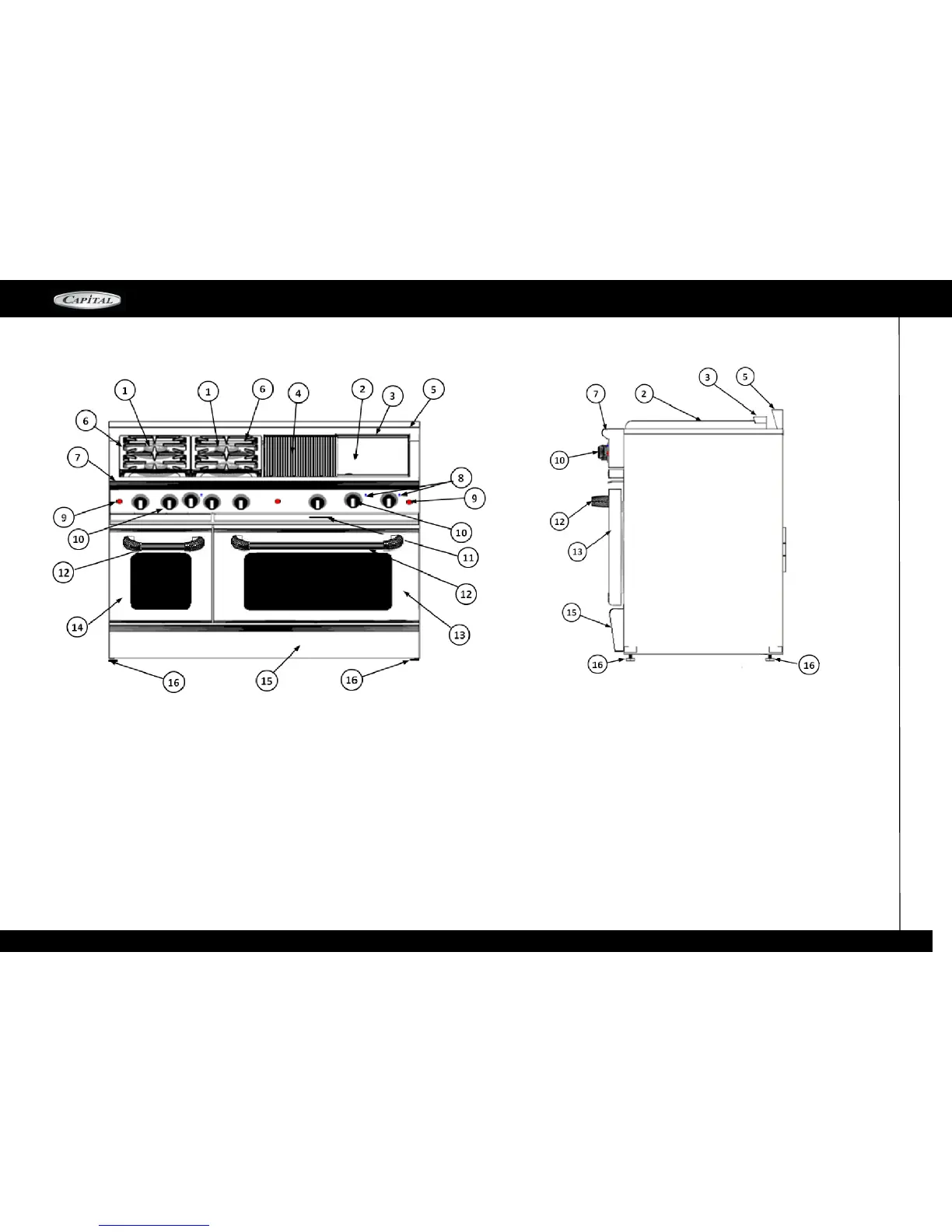 Capital MCR366 - Range Parts Identification; Top Burner and Griddle Parts; Control and Exterior Parts