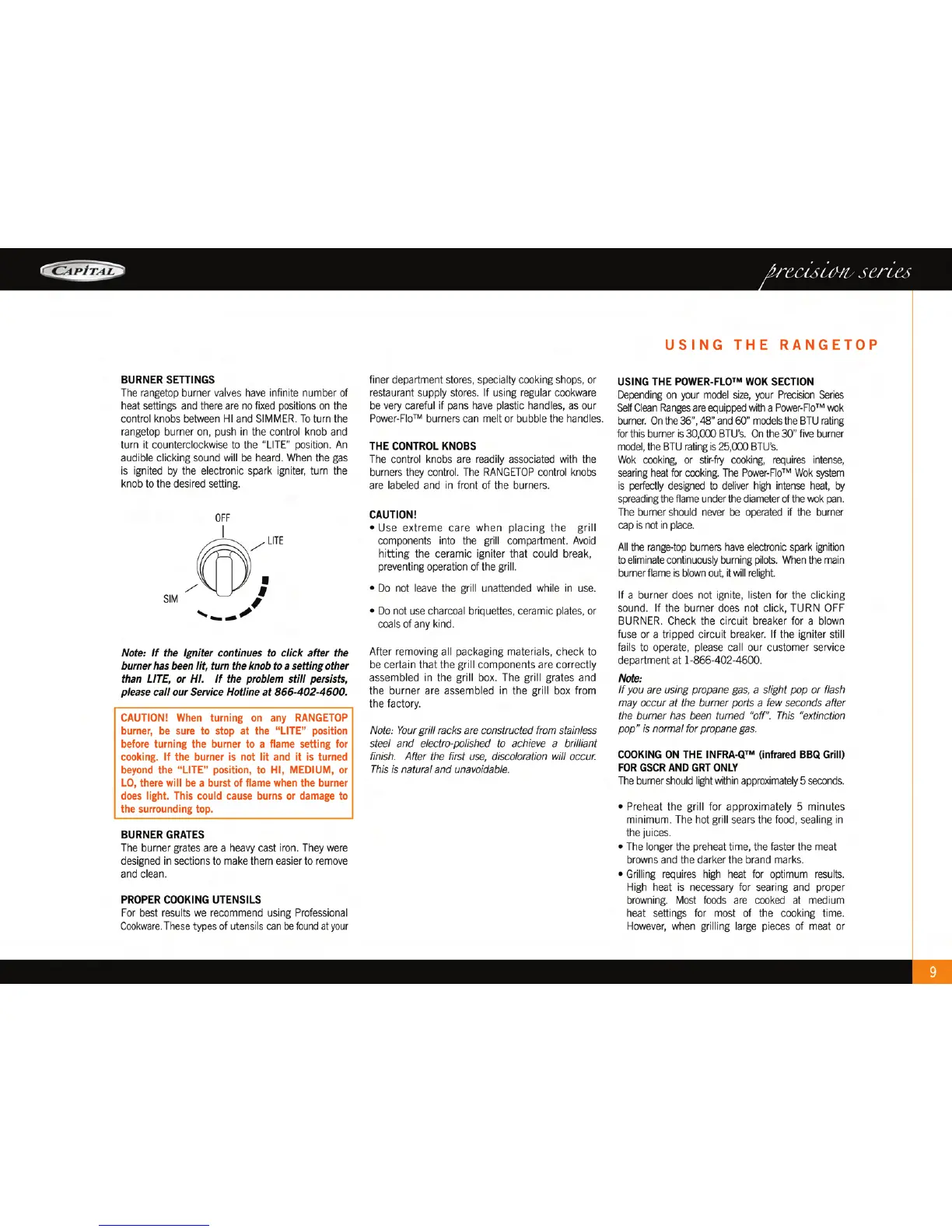 Capital Range - USING THE RANGE-TOP; BURNER SETTINGS; THE CONTROL KNOBS; USING THE POWER-FLO WOK SECTION