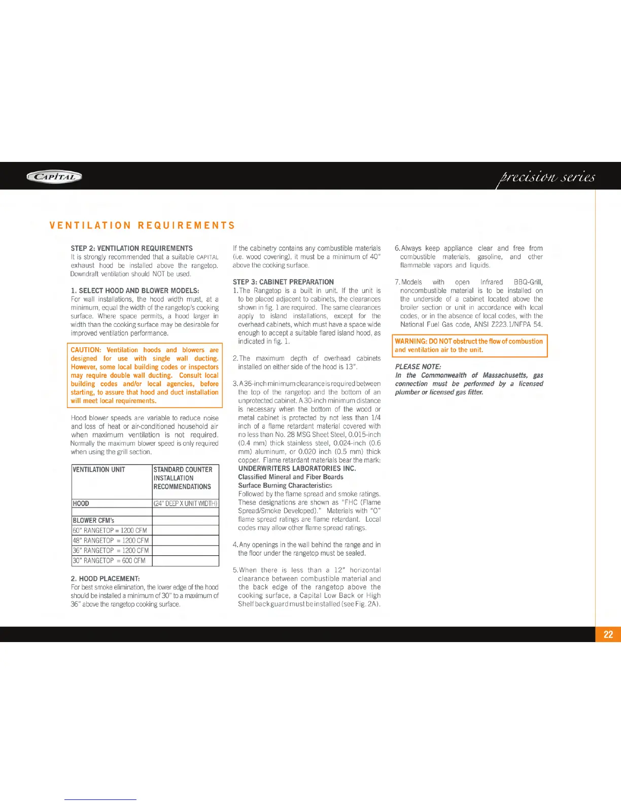 Capital Range - VENTILATION REQUIREMENTS; SELECT HOOD AND BLOWER MODELS; HOOD PLACEMENT; CABINET PREPARATION