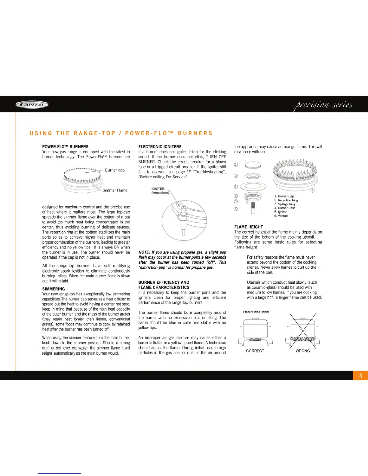 Capital Range - USING THE RANGE-TOP; POWER-FLO BURNERS; ELECTRONIC IGNITERS; BURNER EFFICIENCY AND FLAME CHARACTERISTICS