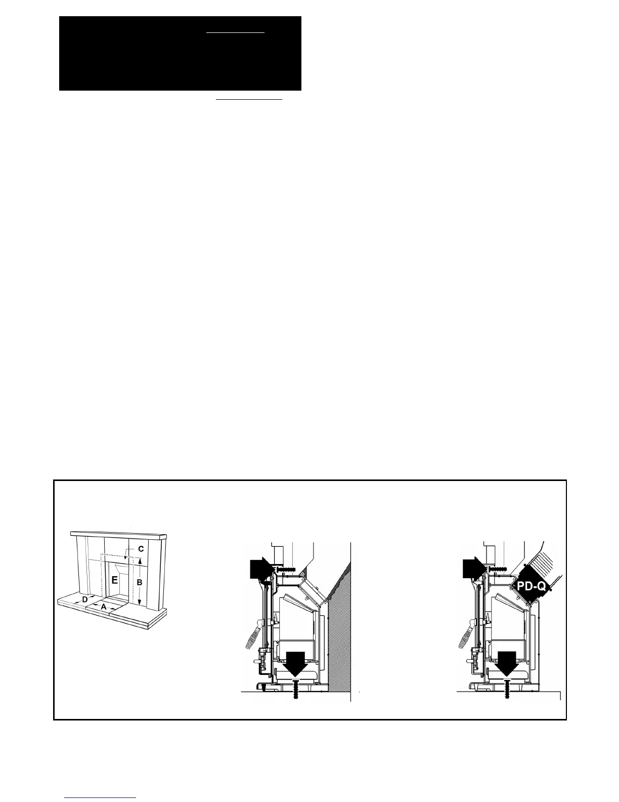 dealer. Pull off top and push stove into the opening. Screw to the masonry of the fireplace at the FOUR points arrowed (two through