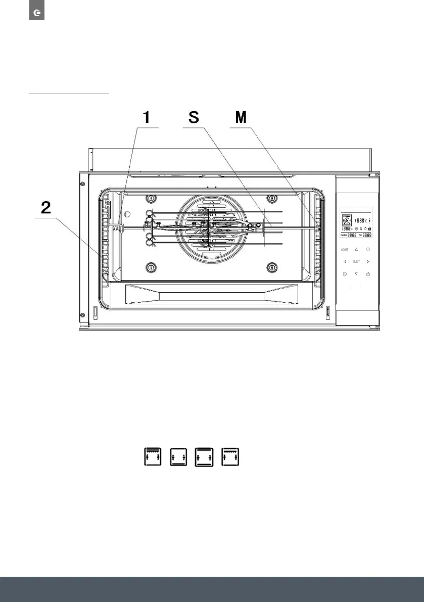 - Fit the end of the spit into the motor M at the back of the oven.