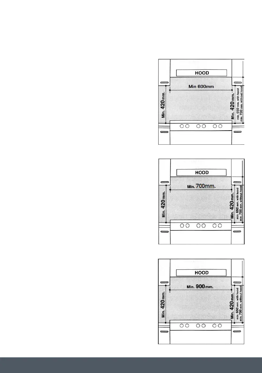 d) Should the hob be installed directly under a cupboard, the cupboard should be at least 700mm from the
