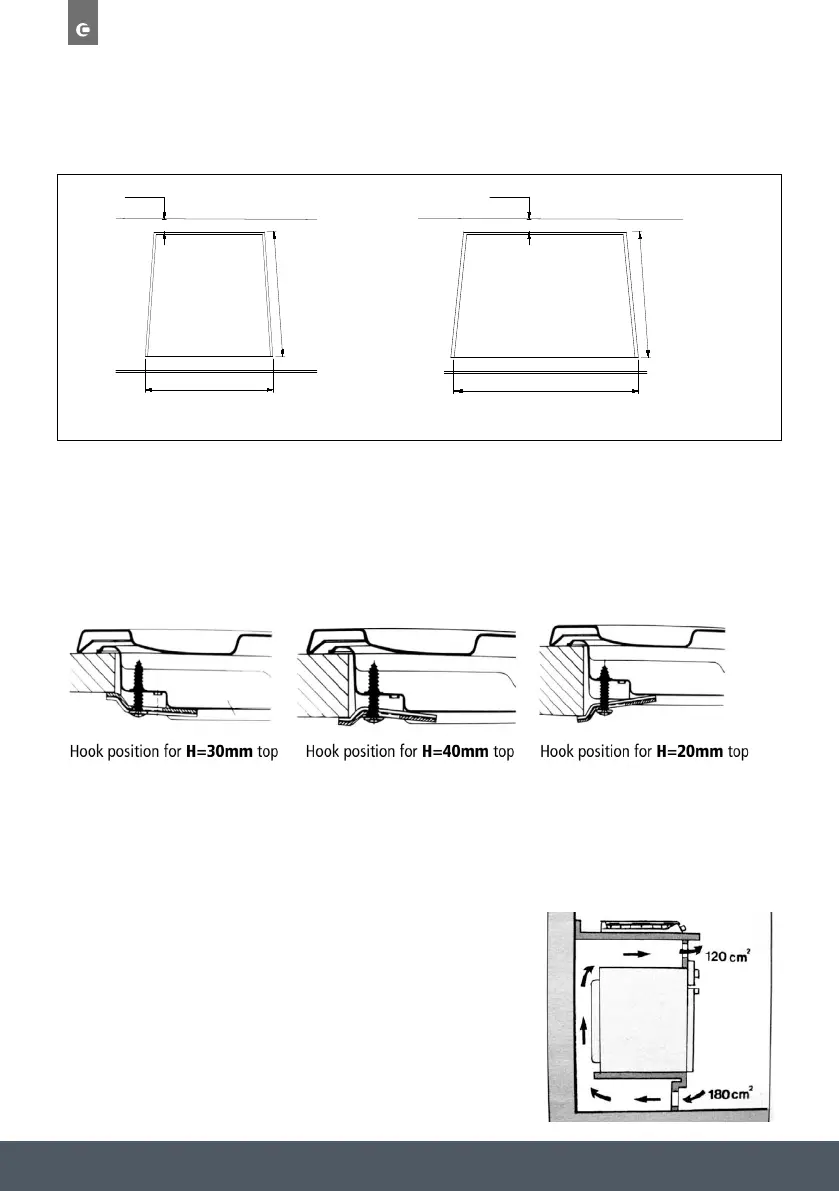 e) The cut out dimensions for the worktop must be those indicated in the figures shown below. Fixing hooks