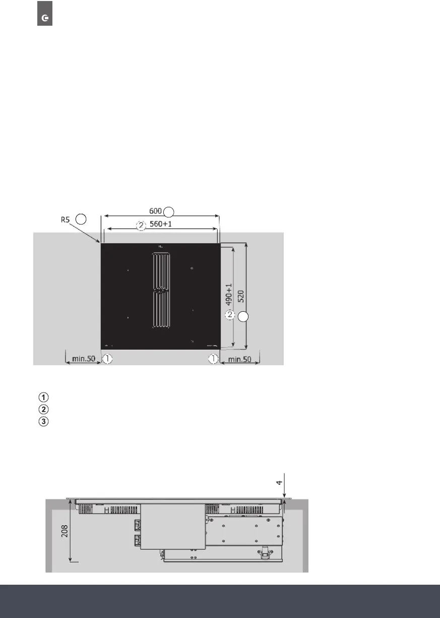 The area is cut out as illustrated. The glass ceramic hob must have a level and ush bearing.