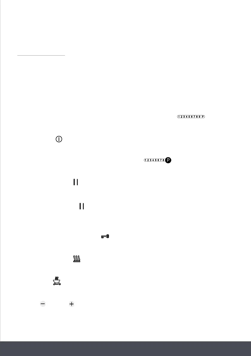 The hob is operated with touch control sensor keys. The sensor keys are operated as follows: